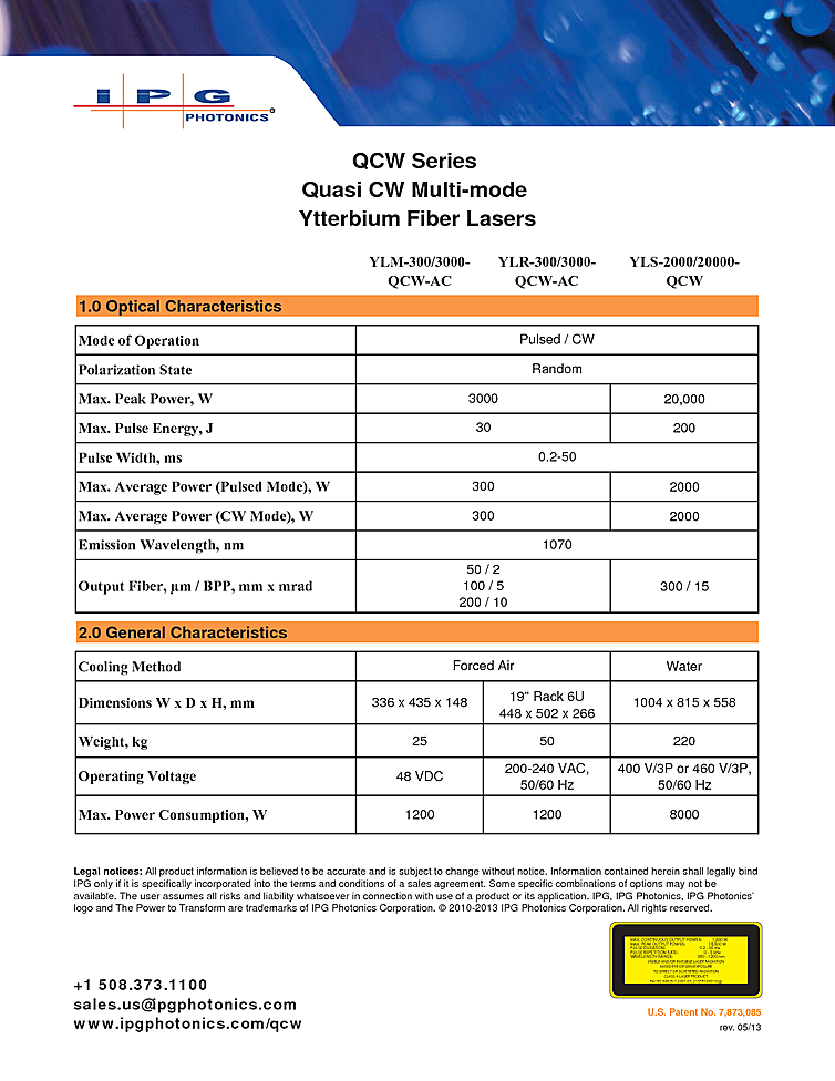 Fiber laser with Quasi-CW high power output from IPG Photonics. Key features of the fiber laser are Outstanding Pulse Power/ Energy Stability, Energy Efficient: >30% Wall-plug Efficiency, Low Cost Solution offering High Peak Power, Versatile Fiber Laser Working in CW & Pulsed Modes, Optimized Beam Quality, and Internal Pulse Generator & Pulse Shaping. Typical applications include Spot Welding, Seam Welding, Microwelding, Drilling, Cutting, Batteries and Medical Devices. CW and Pulsed modes of operation with maximum peak power of 20,000 watts or 200J. IPG Photonics fiber laser output at 1070nm and 2000 watt average output power.