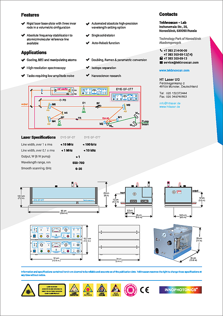 "Frequency-stabilised CW single-frequency ring Dye laser, model DYE-SF-077, is a further development of model DYE-SF-07. It now includes a system of frequency stabilisation on the basis of a thermo-stabilised interferometer and a fast electronic driver.