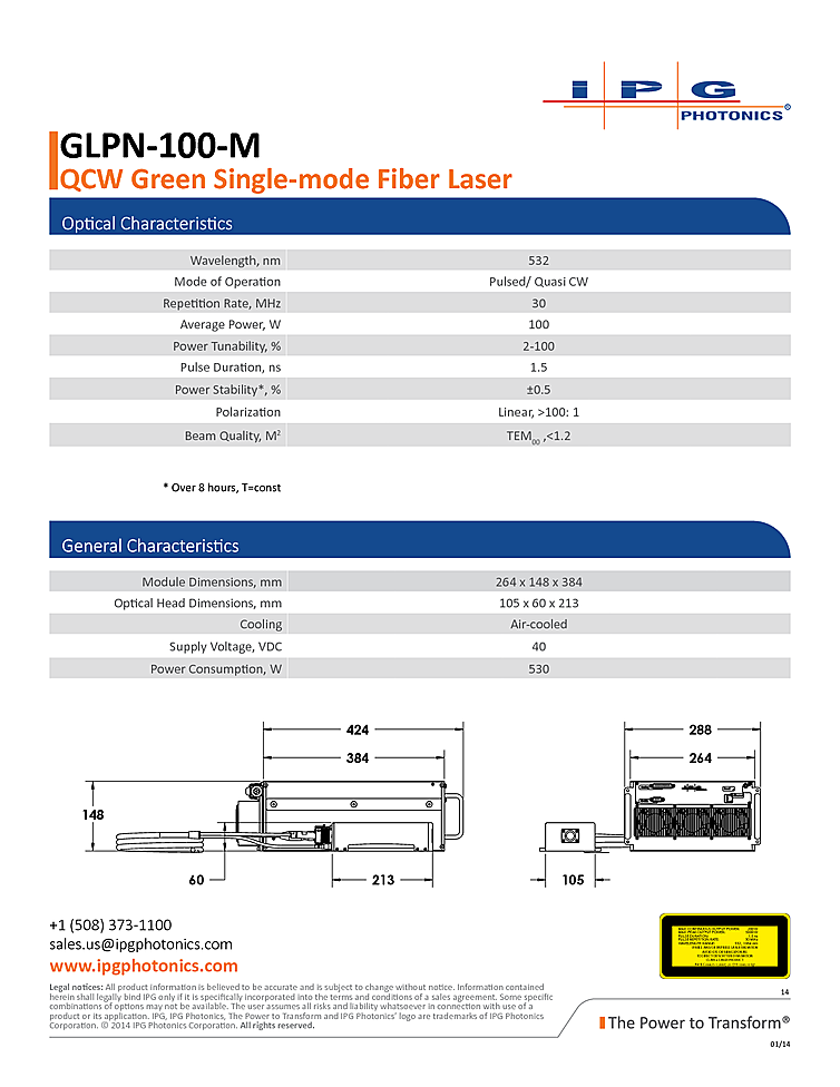 Single-mode fiber laser system from IPG Photonics. The follow features have been designed into the fiber laser: Output Power 100 watts, Beam Quality M2<1.2, Power Stability 1%, Power Consumption 530W, Linear Polarization >100:1, Compact and Low Cost OEM Package. Applications for the fiber laser include Welding and Cutting of Highly-reflective Metals, Solar Cell Manufacturing, Semiconductor Wafer, Annealing, Laser Shows and Laser Projectors. Pulsed and Quasi-CW modes with pulse repetition rate of 30MHz and pulse duration of 1.5ns. Fiber laser average output power is 100 watts at a wavelength of 532nm.