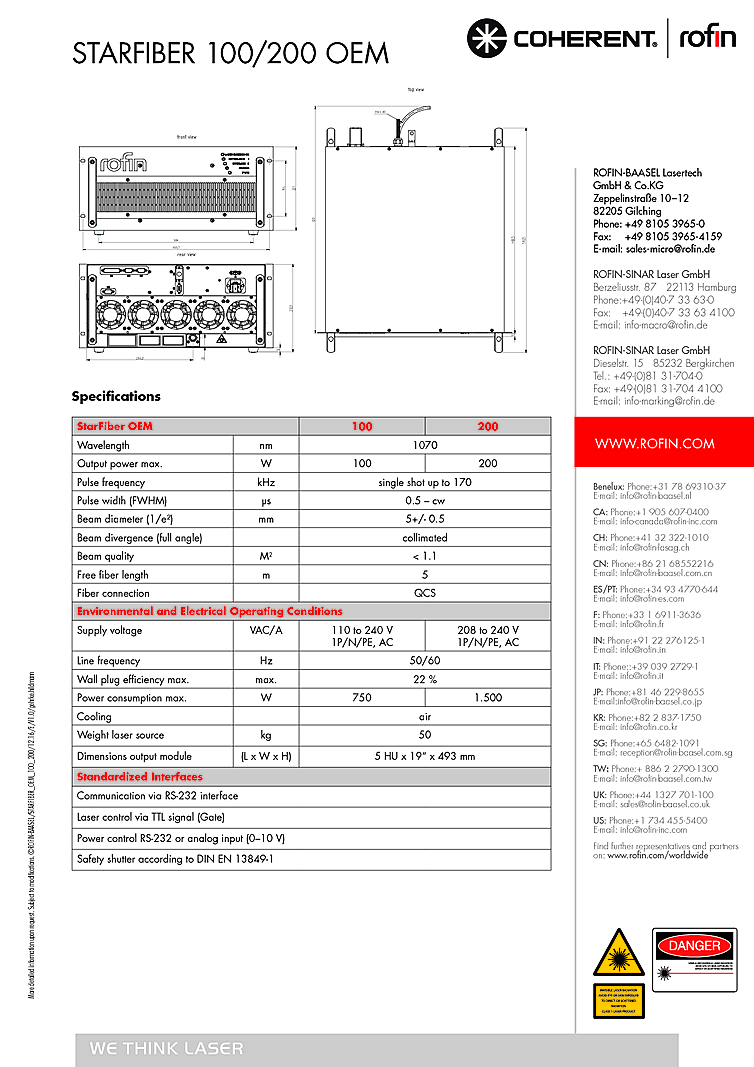 According to the data sheet attached, the Coherent-ROFIN StarFiber is a robust & compact fiber laser source which has been optimized for industrial laser material processing applications. The StarFiber laser allows very small seam geometries at very high welding speeds. The welded joints show maximum strength with minimal heat input to the work pieces.