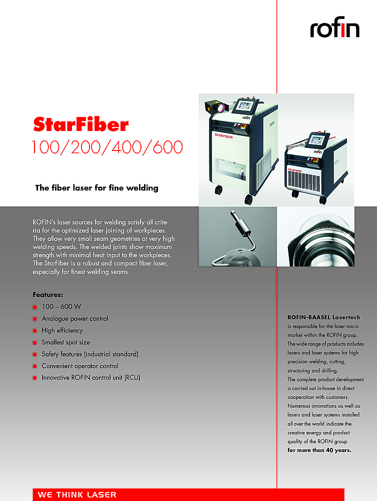 Fiber laser with CW output from Rofin. Key features of the laser include analogue power control, high efficiency, smallest spot size, safety features (industrial standard) and convenient operator control. CW Laser can also be operated in Quasi-CW with pulse repetition rate up to 50kHz and pulse duration of 1µs. The fiber laser can be controlled via TTL signal and parameters are set via 24V. Remote communication via Ethernet or anlog input. Options for the fiber laser include Scanner system, Pilot laser, Camera view or Remote maintenance. FIber laser output is up to 600 watts at a wavelength of 1070nm.