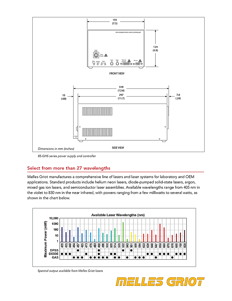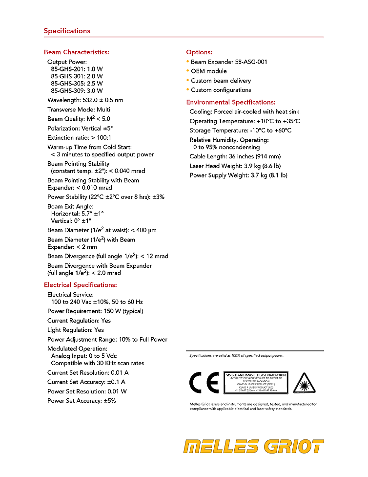 CW laser with high output power from Melles Griot. The compact and light weight diode pump solid state laser uses forced-air cooling and has low power consumption. The laser can operate in CW mode or modulation with external source and has automatic power control. CW laser features an RS-232 interface for remote computer control of the laser parameters. Beam quality is M2<3 with less then 12mrad diveregence. Careful attention to the design allows for 8 hour power stability of +/-3% with a beam pointing stability of 0.04mrad with a temperature flucation of +/-2°C. CW Laser output power up to 3 watts at a wavelength of 532nm.