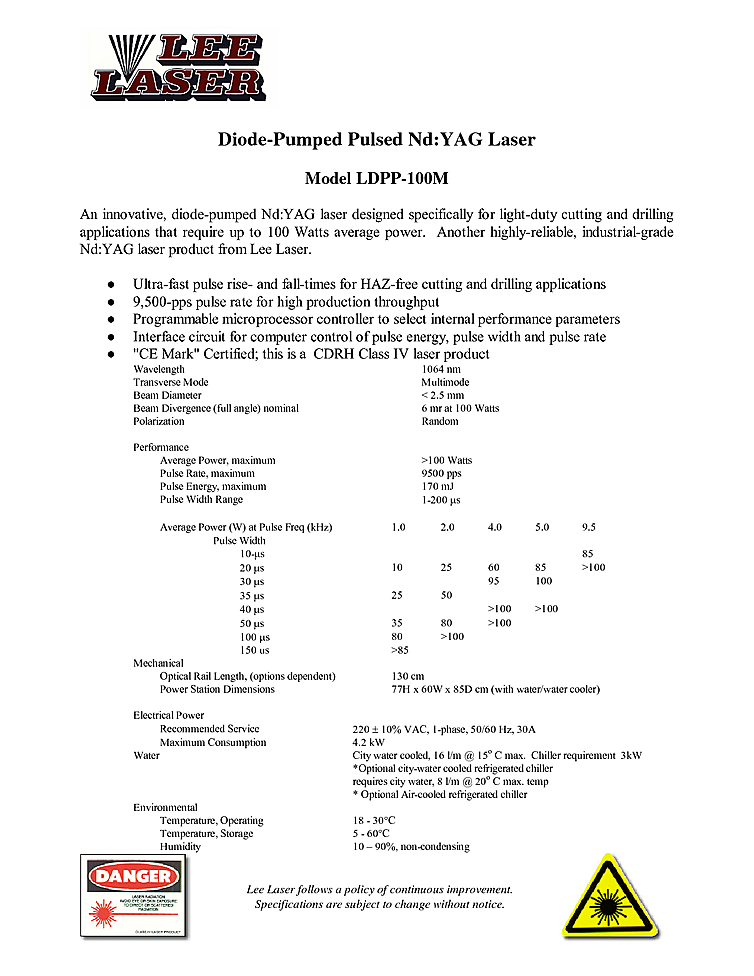 Nd:YAG laser from Lee Laser has the following features Ultra-fast pulse rise-times and fall-times for cutting and drilling applications, microprocessor controller to select internal performance parameters, and computer control of pulse energy, pulse width and pulse rate. Diode pumped Nd:YAG provides long laser lifetime. The average power is greater then 100 Watts with a pulse rate less then 9500pps. Maximum Pulse Energy is 170mJ with a pulse width range of 1-200µs. The Nd:YAG laser has a wavelength of 1064nm.