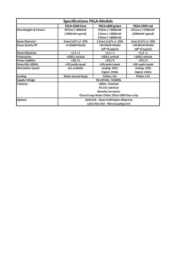 CW laser from Omicron. Features high optical output up to 8 watts at a wavelength of 532nm. Beam diameter is 2.5mm +/-25% and multi-mode beam quality of M2<10 as low as 6 M-squared. Power stability less then 5% and noise over the range of 0-10MHz is less then 5%. Digital modulation up to 25kHz and analog modulation up to 10kHz. CW Laser is cooled by integrated thermoelectric cooler and air. Safety interlock and RS-232 remote computer interface.