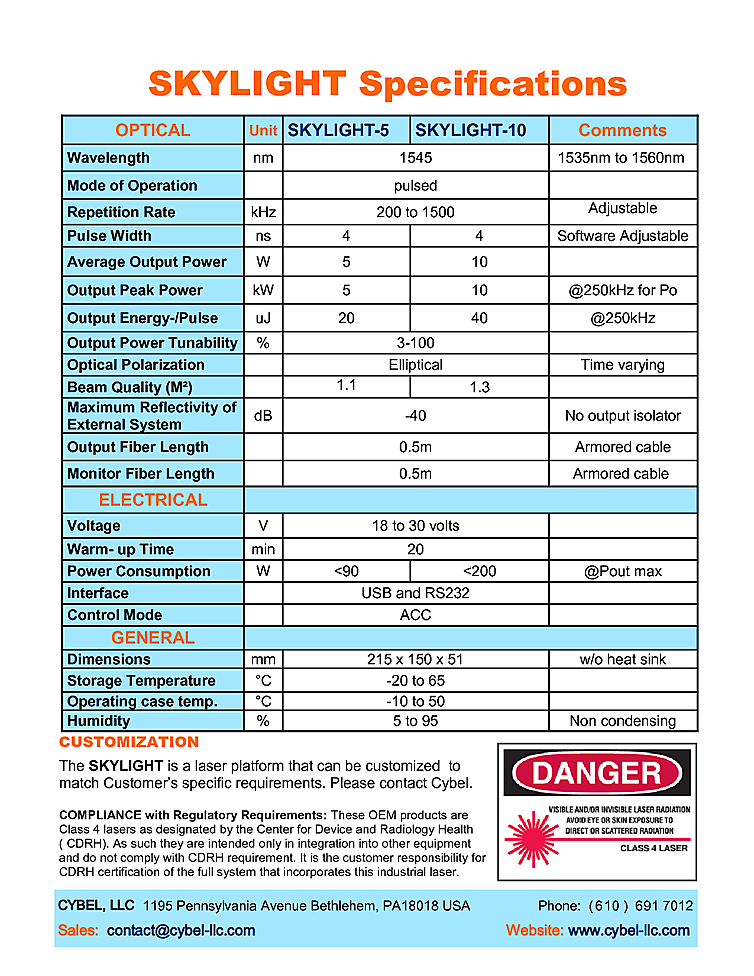 Fiber laser with nanosecond pulsed output from Cybel. Common applications for the eye safe laser include LIDAR-LADAR, Range finding, Mapping, Remote sensing, Non linear optics conversion, and Seed source for Amplifiers. Fiber laser key features include adjustable repetition rate 200kHz to 1.5MHz, adjustable pulse width, compact & rugged design, Optical trigger output, and PM version. The laser also has a RS-232 or USB interface for remote operation and control. High beam quality M2<1.3. High energy fiber laser with output up to 40uJ at a wavelength of 1550nm.