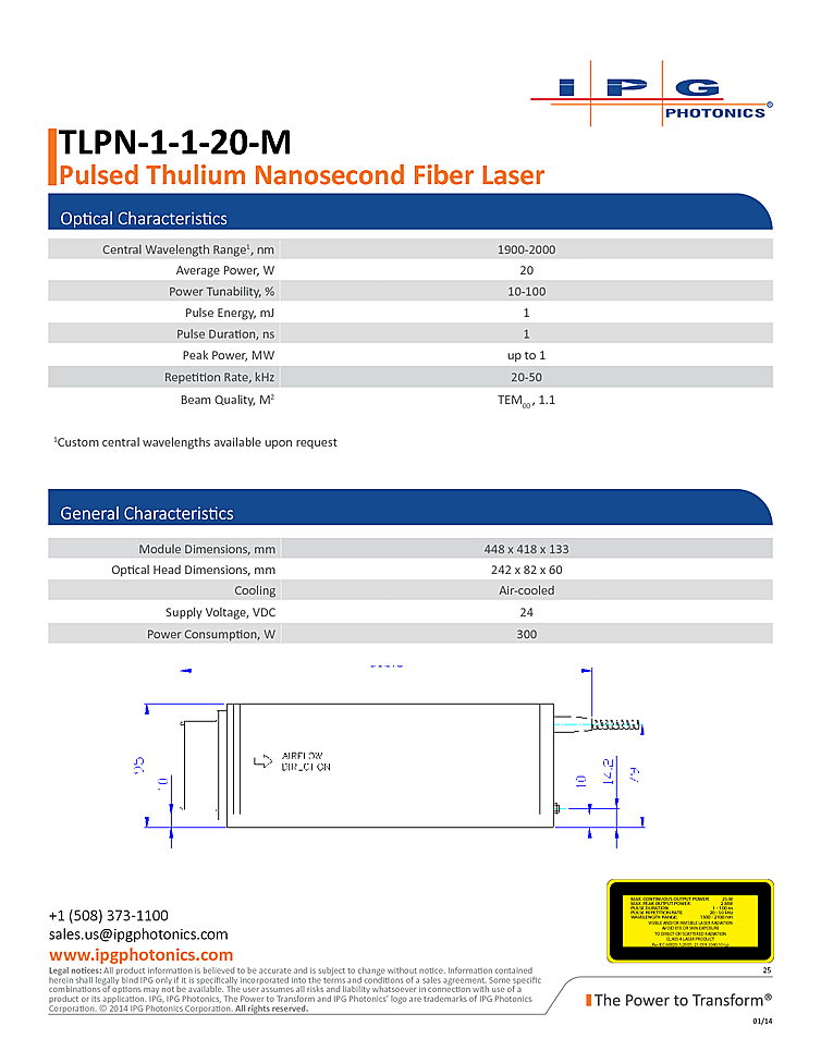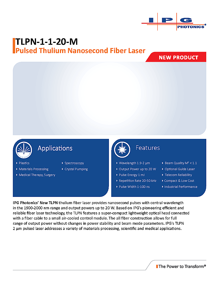 IPG Photonics fiber laser with adjustable nanosecond pulse output and repetition rate. Applications for the nanosecond laser include Plastics, Materials Processing, Medical Therapy, Surgery Spectroscopy and Crystal Pumping. Pulse width from 1 ns to 100 ns with a pulse repetition rate of 20 kHz to 50 kHz. Beam quality of M2 less then 1.1. IPG Photonics fiber laser output energy up to 1 mJ at a wavelength of 1900nm.
