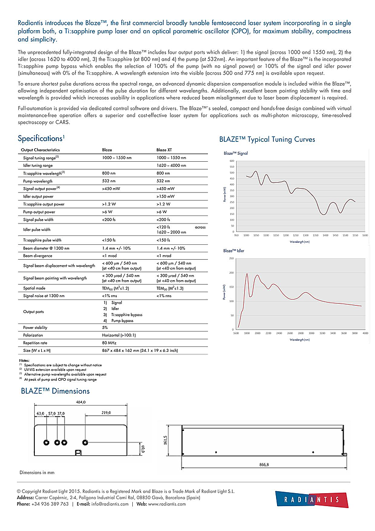 Ti:Sapphire Laser features a fully integrated OPO and laser from Radiantis. The femtosecond laser was designed for applications in multi-photon microscopy, raman and time-resolved spectroscopy and semiconductor research. Laser also has an integrated spectrometer. Ti:Sapphire laser with output power up to 450mW and wavelength tuning range of 1000nm-1550nm.