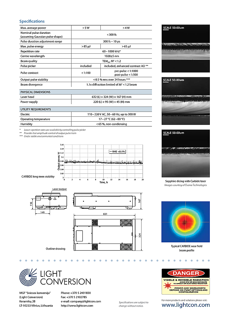 Femtosecond laser from Light Conversion is designed for applications in biomedical, micromachining, micro and nano structuring, multi photon polymerization, nonlinear optics, spectroscopy and microscopy. Tunable pulse duration less then 300fs, flexible repetition rate from 60-1000 kHz, pulse energies greater then 85 µJ, and output powers up to 5 watts. Laser also includes pulse picker for pulse-on-demand operation. Rugged, industrial grade mechanical design and can be either air or water cooled. Femtosecond laser wavelength output is 1028nm.
