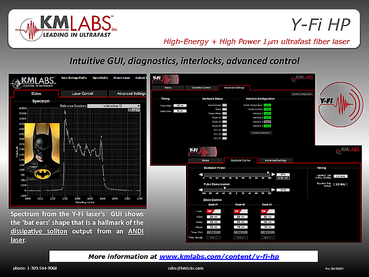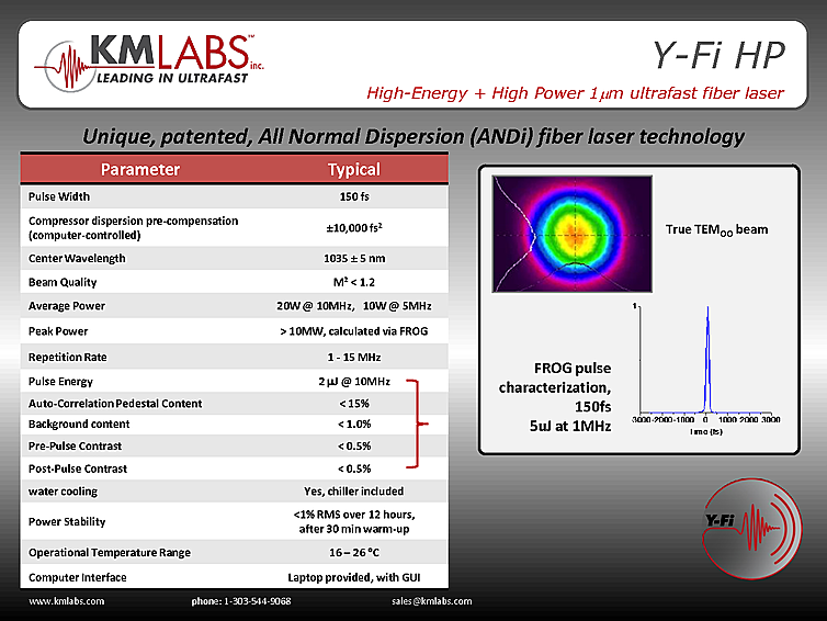KM Labs femtosecond fiber laser has a Tunable repetition rate and Computerized pulse width pre-compensation. Pulse width is 150 fs with a Repetition Rate from 1 MHz - 15 MHz. Power stability of <1% RMS over 12 hours after 30 min warm-up. Beam quality of M2 less then 1.2. Fiber laser with femtosecond pulse output at a wavelength of 1035nm and output energy up to 5µJ.