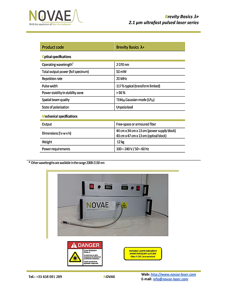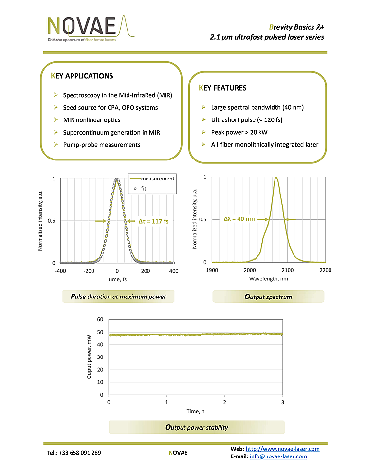 Key features of the femtosecond fiber laser include large spectral bandwidth (40nm), peak power up to 20 kW and all-fiber monolithic integrated laser. Manufacturer of the fiber laser is Novae laser. The femtosecond laser was designed for applications in spectroscopy, seed laser for OPO and CPA and pump probe measurements. Femtosecond pulse duration less then 120fs and 20 MHz repetition rate. Femtosecond laser with average output power up to 50mW at a wavelength of 2070nm.