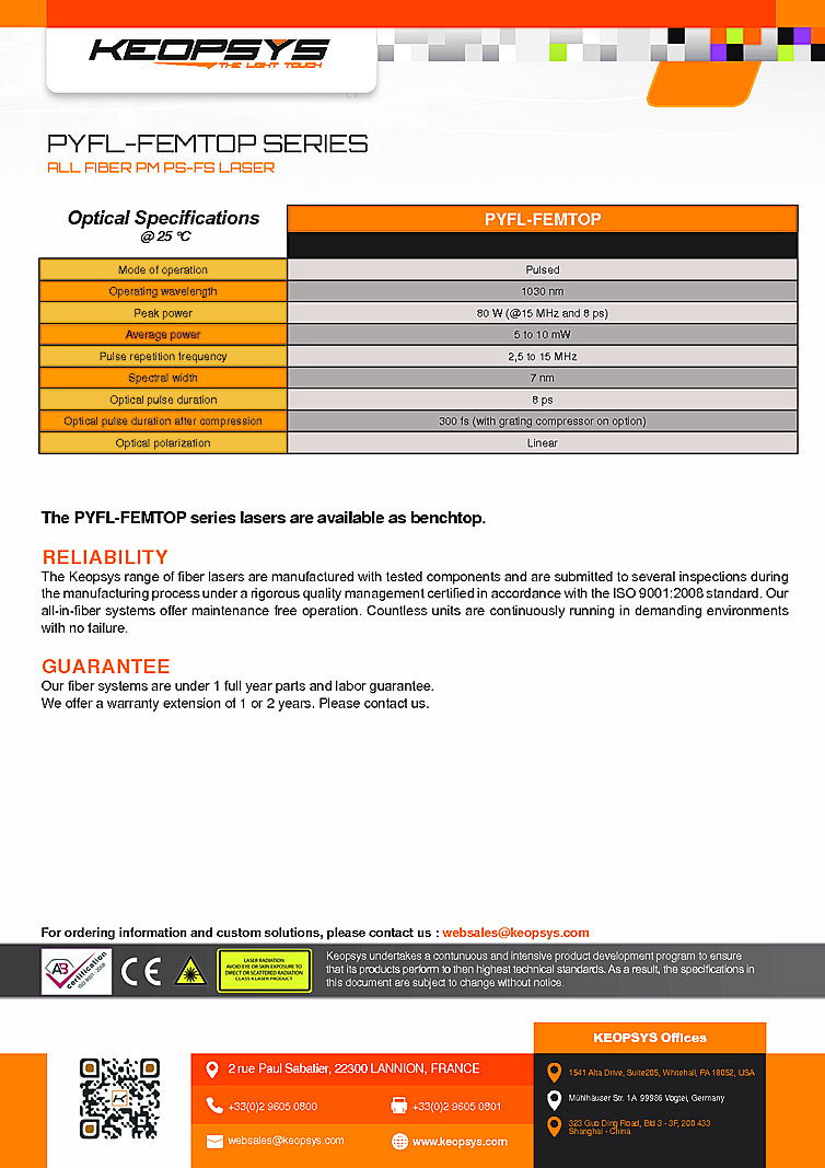Ytterbium Femtosecond Pulsed Laser from Keopsys. Key features of the femtosecond laser include all PM design, self starting, and no saturable absorber. Available with repetition rates from 2.5 to 15 MHz with pulse duration of 8 picoseconds. Serial PC interface with integrated software controller for remote operation. Ideal seed laser for femtosecond micromaching applications requiring polarization-maintaining output which is based on passively mode-locking technique. Femtosecond laser with peak output power up to 80 watts at a wavelength of 1030nm.