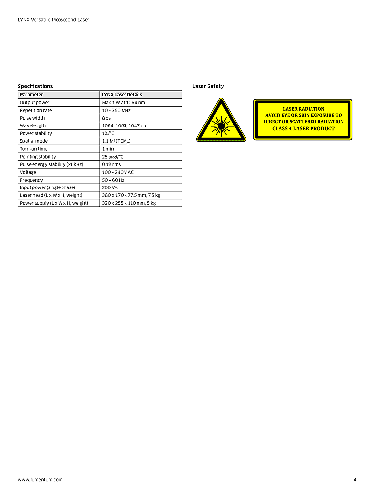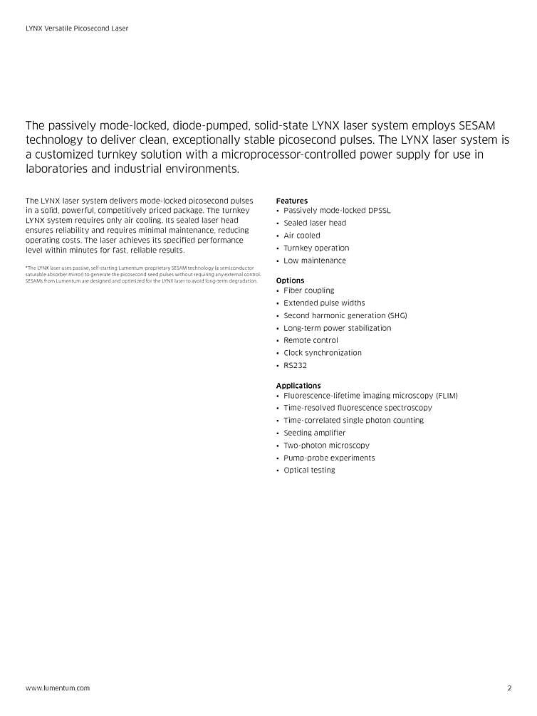 Lumentum Picosecond Laser designed for long life time and minimal maintenance. Picosecond laser features a passively mode locked all solid state design and pump laser diode. Output power up to 1 watt at 1064 nm.