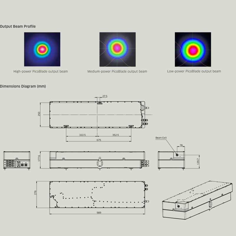 The newly redesigned PicoBiade platform provides the same flexibility as the former generation in a much smaller package to facilitate the integration and help reduce the footprint of your machine. The PicoBlade 2 system consists of a laser head, an electronic controller and a closed-loop water chiller. The optical components are