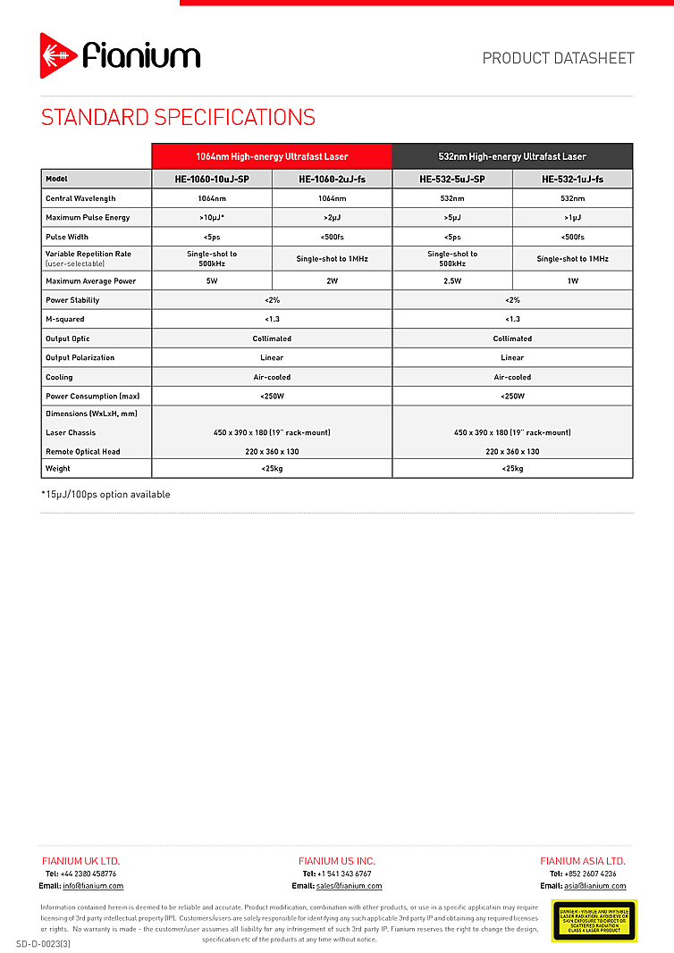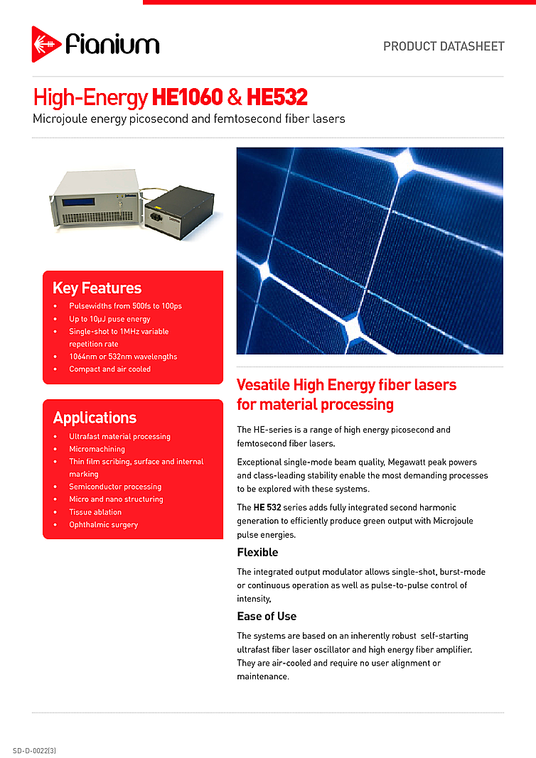 Exceptional single-mode beam quality, Megawatt peak powers and class-leading stability enable the most demanding processes to be explored with these systems. The picosecond laser adds fully integrated second harmonic generation to efficiently produce green output with Microjoule pulse energies. The integrated output modulator allows single-shot, burst-mode or continuous operation as well as pulse-to-pulse control of intensity. The systems are based on an inherently robust self-starting ultrafast fiber laser oscillator and high energy fiber amplifier. They are air-cooled and require no user alignment or maintenance. The Fianium fiber laser has an energy output up to 10µJ at a wavelength of 1064nm.