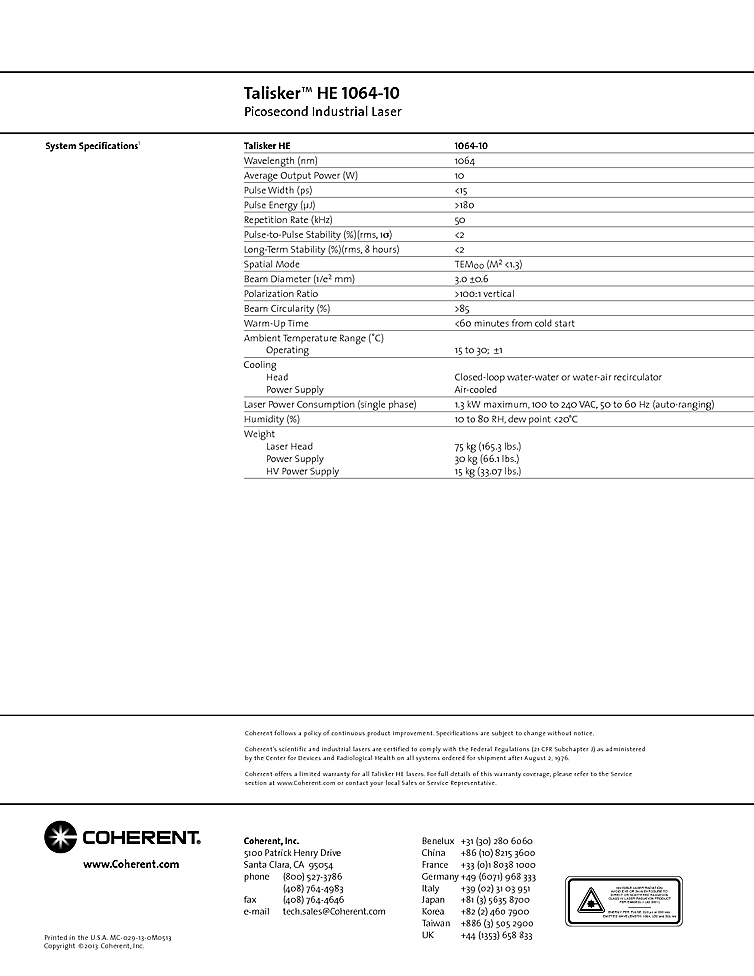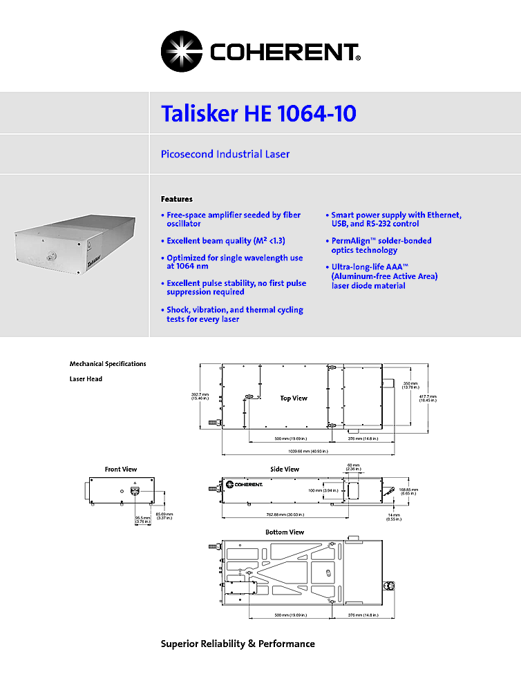 Coherent picosecond laser designed for industrial applications. The picosecond laser uses a free-space amplifier which is seeded by a fiber oscillator. Laser was designed and is manufactured for long term reliability and performance by utalizing high quality laser diodes for source and requiring every laser be tested for shock, vibration, and thermal cycling. No first pulse suppression is required and excellent pulse stability of less then 2% over 8 hours of operation and pulse-to-pulse stability less then 2% RMS. Picosecond laser hs a beam quality of M2<1.3. For remote operation Coherent laser can be controlled with Ethernet, USB, or RS-232. Picosecond laser with a wavelength of 1064nm and energy of 180µJ.