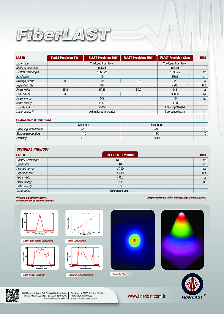 High peak power fiber laser system from FiberLAST. Applications for the picosecond laser include Micromachining, Solar/photovoltaic material processing, THz generation, Ablation, Texturing, Precise surface treatment, Spectroscopy, Thin film removal, Obstacle detection, Material recognition, Material processing and Marking. Advantages for the fiber laser are High peak power, No thermal damage, Processing of various materials, Very compact air cooled, Maintenance free, Robust and compact design and Easily integrates into OEM products. Fiber laser output energy up to 1µJ with a wavelength of 517nm.
