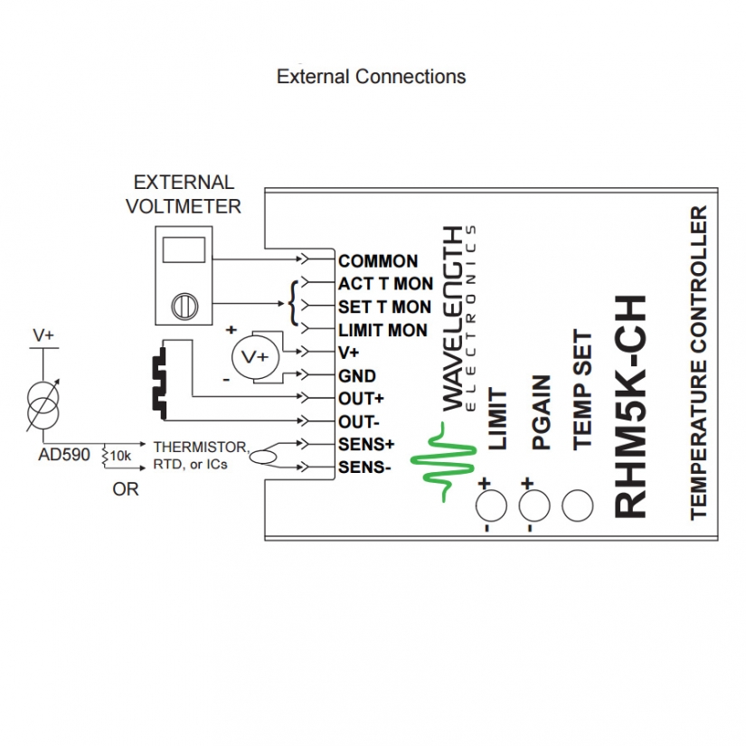 The RHM offers a high level of stability and can drive up to 5 A with a small footprint. On-board 12-turn trimpots control temperature setpoint, proportional gain, and output voltage limit. A single 10-pin terminal strip provides easy access to the DC supply, sensor, resistive heater, and measurement connections.