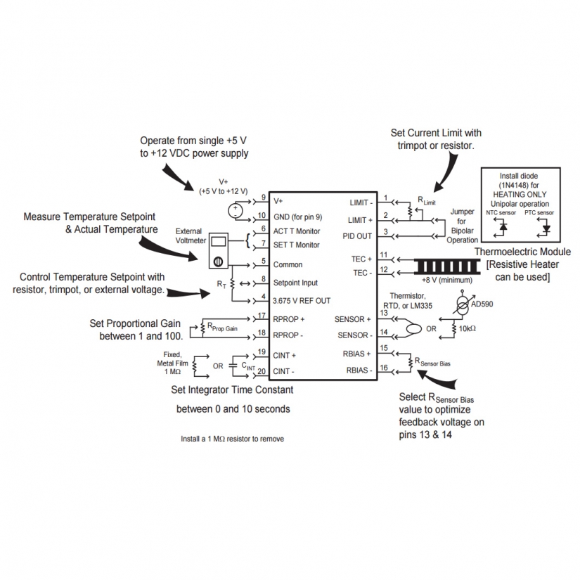 Two monitor pins provide access to the temperature setpoint voltage and the actual sensor voltage.