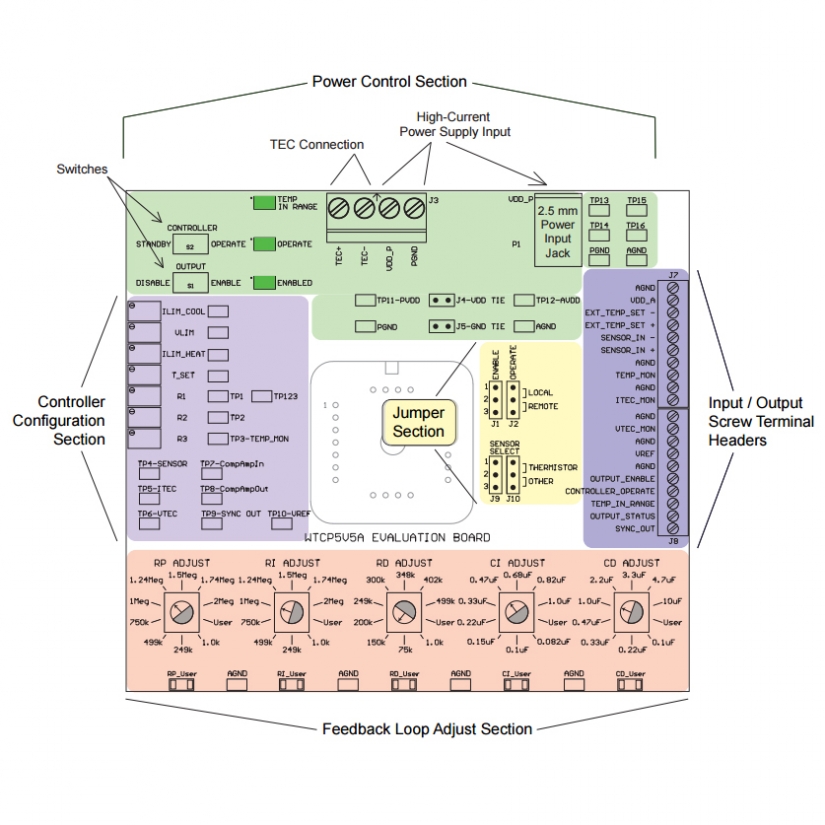 The WTCP5V5A is designed for easy integration. It can operate from a single 5 V power supply, or the WTCP and load can be driven from separate power supplies for even lower output current noise. It has an available WTCPEVAL evaluation circuit board includes everything needed to quickly configure the WTCP for a wide range of applications and load conditions. The onboard feedback loop adjustment switches simplify tuning, and dramatically reduce your development time.