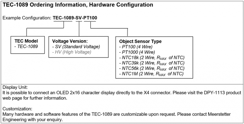 The analog measurement circuit of the TEC-1089 is factory calibrated. It also has an auxiliary temperature input which allows the connection of an NTC probe that is located on the heat sink of the Peltier element. The heating and cooling power is optimized by proprietary thermal management routines based on power balance models (for Peltier elements and resistive heaters).