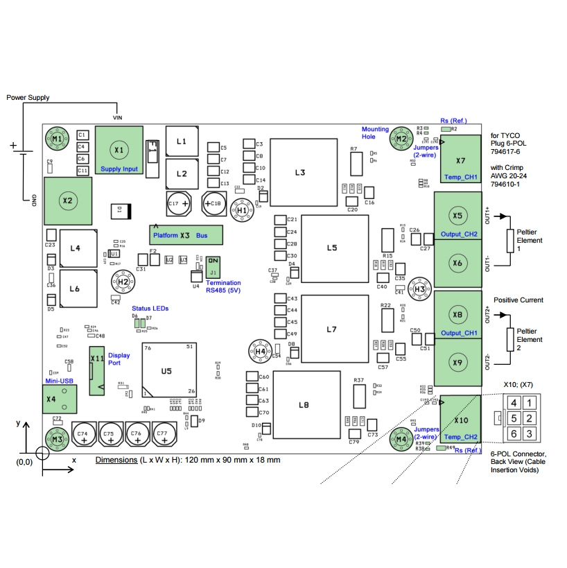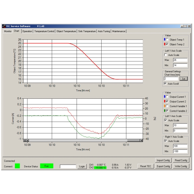 The TEC-1122 is fully digitally controlled and its firmware offers numerous communication and safety options. It has an included PC-Software allows configuration, control, monitoring and live diagnosis of the TEC controller via USB and RS485. All parameters are saved to non-volatile memory. Saving can be disabled for bus operation.