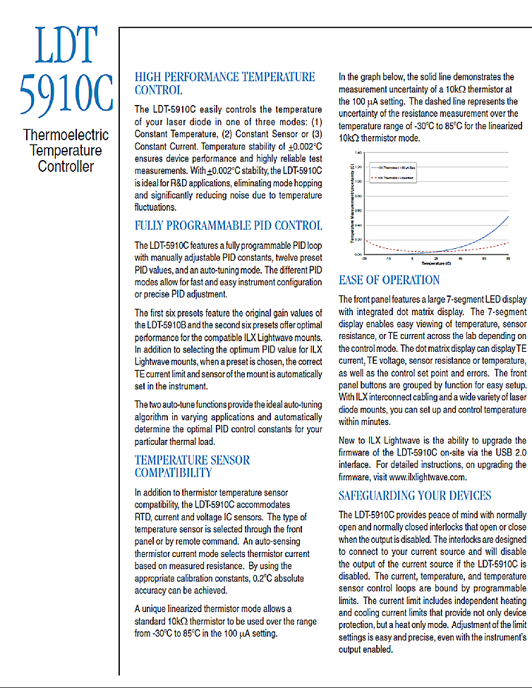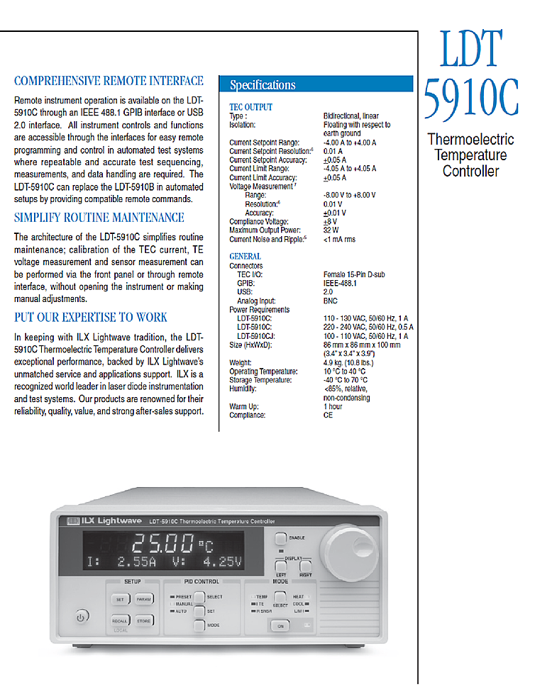 LDT-5910B Replacement This laser diode temperature controller from ILX Lightwave is a replacement for the LDT-5910B series laser diode TEC controller. This product is a 32 Watt thermoelectric temperature control unit with precision set point resolution of +0.001 degrees Celsius. The long term temperature stability of this temperature controller is +0.002 C. Other key features mentioned are a fully programmable PID control loop with auto-tune and preset PID values and independent heating and cooling current limits. The LDT-5910C can operate in constant temperature, sensor, and TE current while measuring TE current, sensor resistance, and TE voltage. These units replaced the obsolete ILX Lightwave LDT-5910B and A series controllers. For more information, please refer to the attached specification sheet.