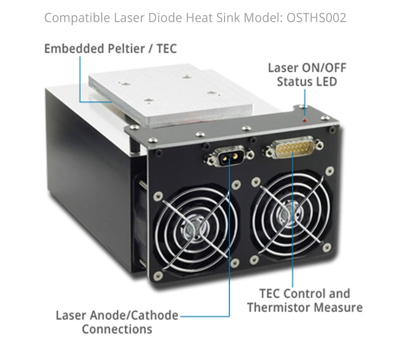 The laser diode heat sink is an actively cooled module with integrated high efficiency TEC elements. It is a high performance mounting solution designed for high power laser diode modules and mounted devices. It is a convenient and high performance solution for cooling and temperature stabilization laser diodes in laboratory environments. Standard mounting hole footprint patterns for many modules and package styles. Custom mounting hole patterns are available upon request.