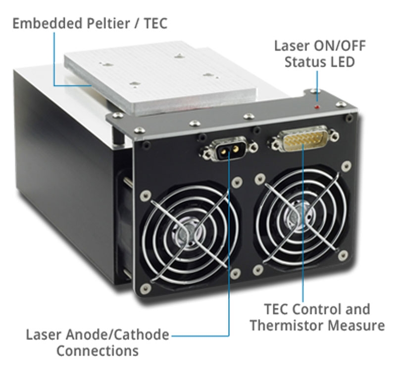 This turnkey laser diode control system was optimized for devices in the 100mW to 3 Watt range. Mounting plates are available for both free space and fiber coupled lasers. This system offers a convenient, affordable solution for current control and cooling of laser diodes in lab environments. Standard mounting hole footprint patterns are available for many modules and package styles, with custom mounting hole patterns available on request. A high power and high reliability TEC embedded under the laser mounting plate works with the dual fans to to provide fast heat removal and stable temperature control. These control systems can ship pre-configured and pre-tested with your laser diode module. Inquire for more details.