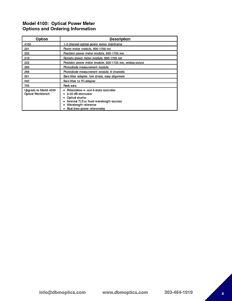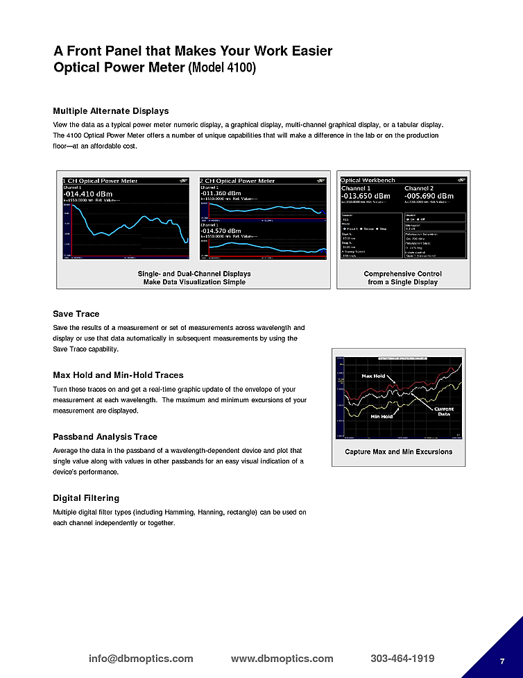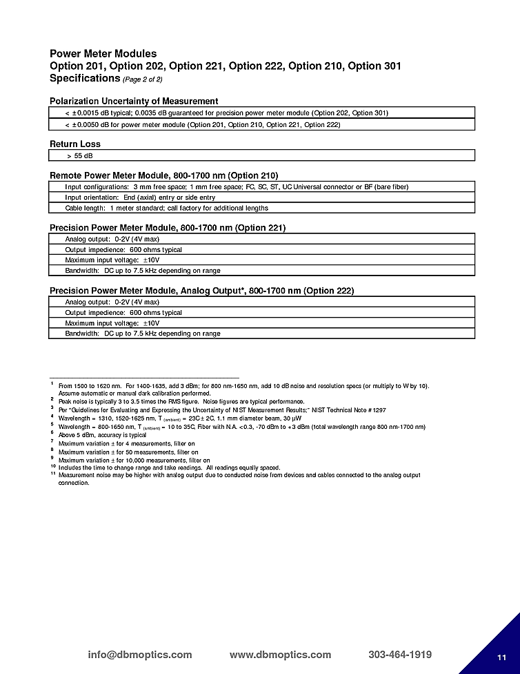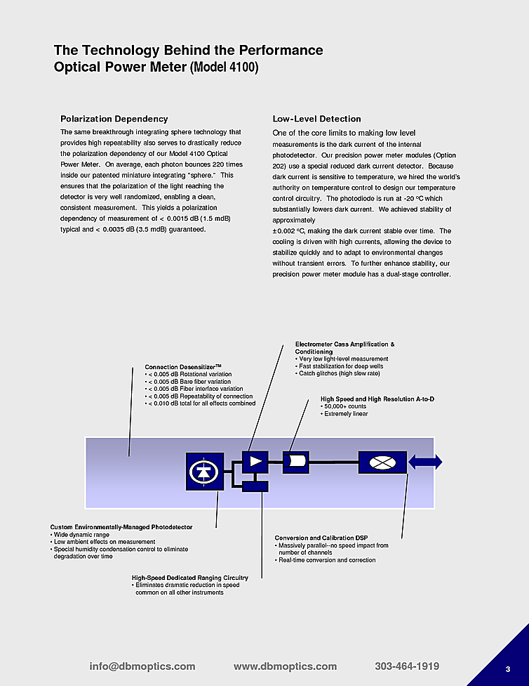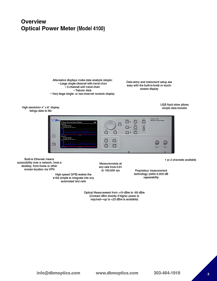 Integrated meter and sensor from dBm Optics provides fast, accurate power measurement from 800nm to 1700nm. Wide dynamic measurement range from +10 dBm to -95 dBm. Optical power sensors are integrated into the benchotp meter providing a compact easy to use platform for measurement of telecommunication laser diodes. Low Polarization Dependency is possible from patented technology that achieves < 0.0015 dB which provides error-free measurement, even with highly polarized light. For automated tests the optical power meter has built in GPIB or Ethernet remote interfaces. The optical power meter can also output results to a USB port for easy data storage and retrieval.