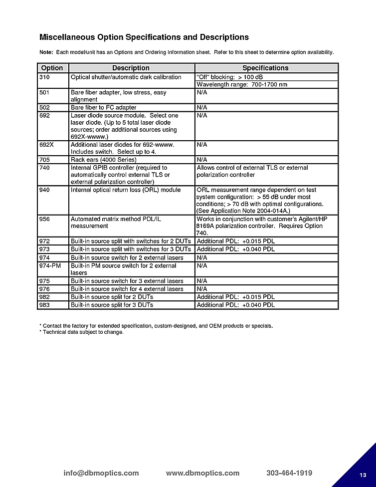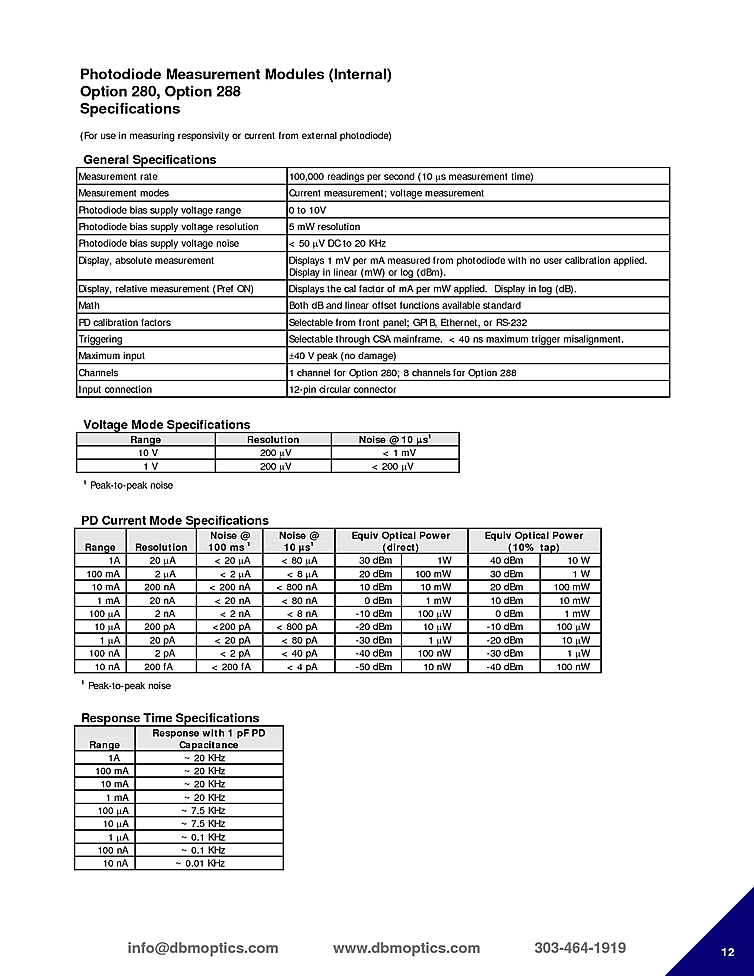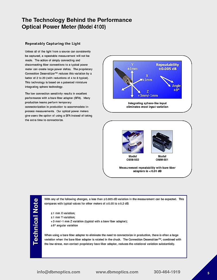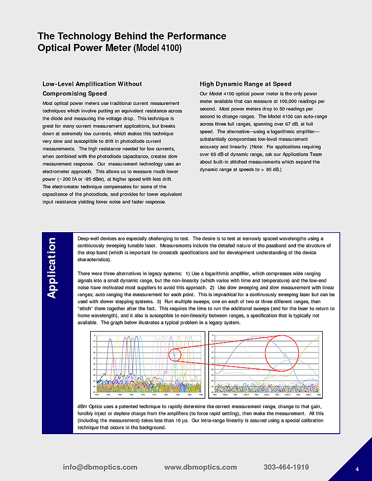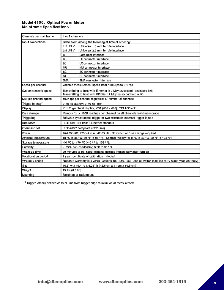 Integrated meter and sensor from dBm Optics provides fast, accurate power measurement from 800nm to 1700nm. Wide dynamic measurement range from +10 dBm to -95 dBm. Optical power sensors are integrated into the benchotp meter providing a compact easy to use platform for measurement of telecommunication laser diodes. Low Polarization Dependency is possible from patented technology that achieves < 0.0015 dB which provides error-free measurement, even with highly polarized light. For automated tests the optical power meter has built in GPIB or Ethernet remote interfaces. The optical power meter can also output results to a USB port for easy data storage and retrieval.