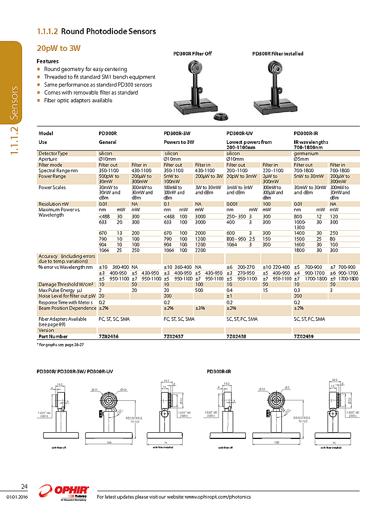 Ophir Photonics optical power sensor uses Si photodiodes to cover a wavelength range from 350nm to 1100nm with an accuracy of +/-5%. Threaded to fit standard SM1 post mounts comes removalbe filter and option fiber optic adapters. For easy centering the physical optical power sensor is round. Measure optical power from 5nW to 100mW.