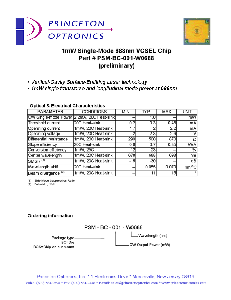 688nm 1mW Single-Mode 688nm VCSEL Chip from Princeton Optronics: Part # PSM-BC-001-W0688 (preliminary)