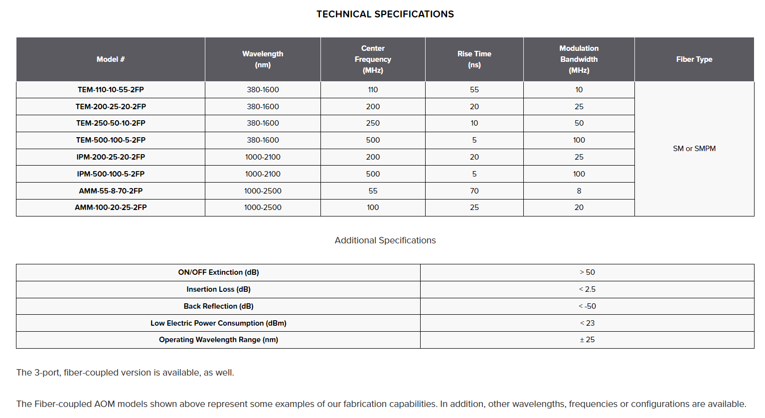 Brimrose all fiber optic, electronically controllable modulators allow the user to vary the output light amplitude, time duration, and periodicity/frequency. Insertion Loss can be as low as 2 dB, Extinction Ratio can be as high as 70 dB, rise times can be down to 5 nsec, periodicity can be up to several hundred MHz. Applications include switching, pulse picking, fast attenuator, etc. Wavelengths can range from near UV to near IR.