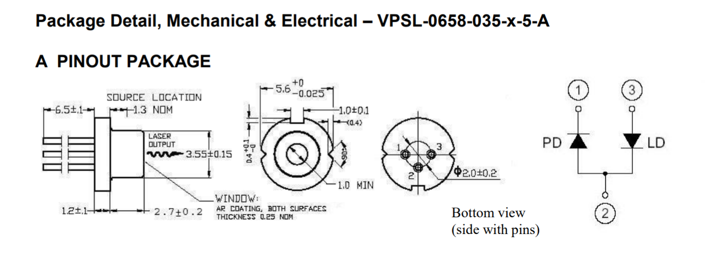 The VPSL-0658-035-x-5-A is a 0.65 µm band, AlGalnP index guided, laser diode with a multiquantum well (MQW) structure. It is suitable as a light source for large capacity optical disc memories, such as DVD-RAM, and various other types of optical equipment. Combined with an integrated, internal, beam correcting optic and encased in a hermetic sealed package, this is a high-performance, highly reliable, and long life laser diode.