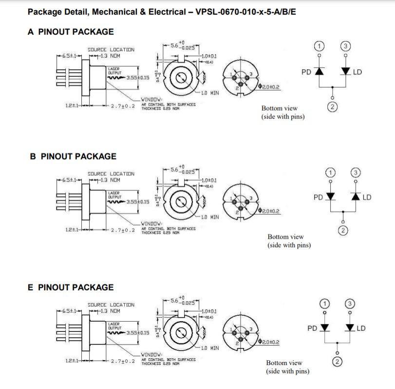 The VPSL-0670-010-X-5-A/B/E is a 0.67 µm band, InGaAlP, circularized, laser diode with a multiquantum well (MQW) structure. It is suitable as a light source for imaging, projection, large capacity optical disc memories, such as DVD-RAM, and various other types of optical equipment. Combined with an integrated, internal, beam correcting optic and encased in a hermetic sealed package, this is a highperformance, highly reliable, and long life laser diode available in 3 different pinouts (A, B or E).