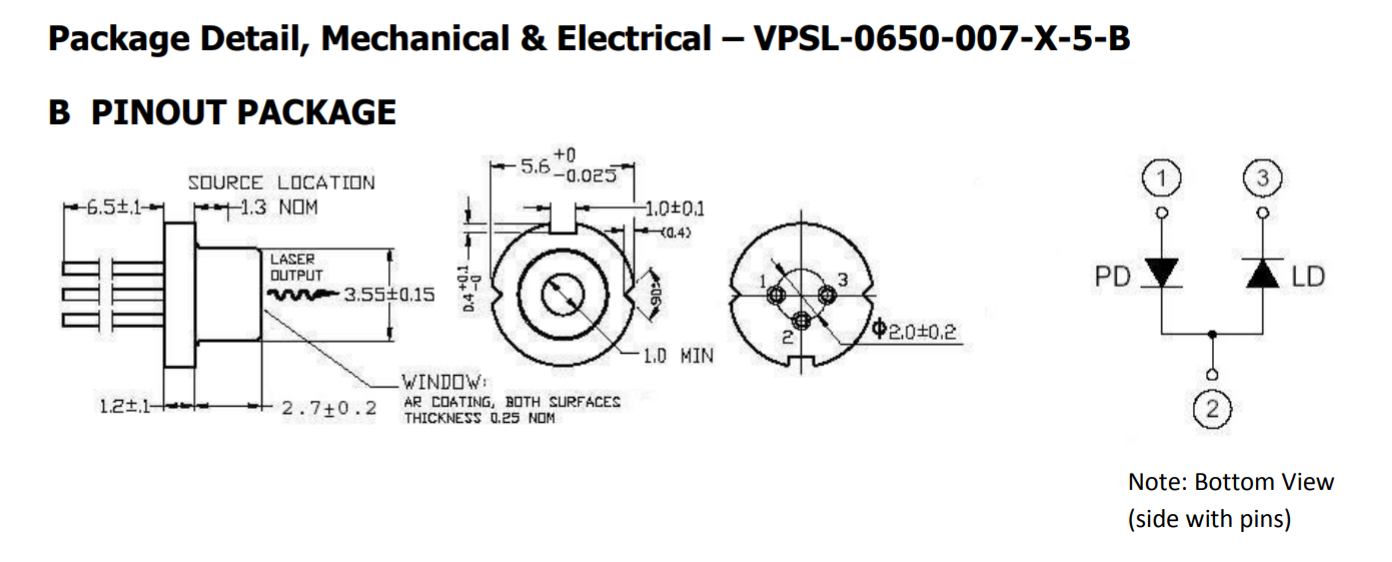The VPSL-0650-007-X-5-B is a 0.60 µm band, AlGaInP index guided, visible laser diode. Applications include; laser pointers, bar code readers, and DVD players. Combined with an integrated, internal, beam correcting optic and encased in a hermetic sealed package, this is a high-performance, highly reliable, and long life laser diode. It is available with one pin-out configuration.