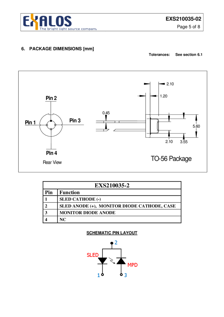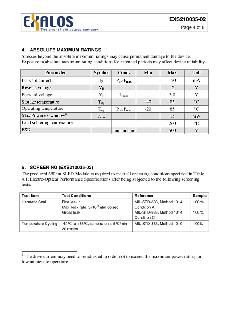650nm SLED Laser devices from Exalos, TO-can packaged, up to 5mW of optical output power from this superluminescent LED. This device offers the following key maximum specifications referenced on the attached data sheet. Forward current is specified at 120 mA maximum. SLED reverse voltage is specified at -2 Volts maximum, and forward voltage is specified at 3V.