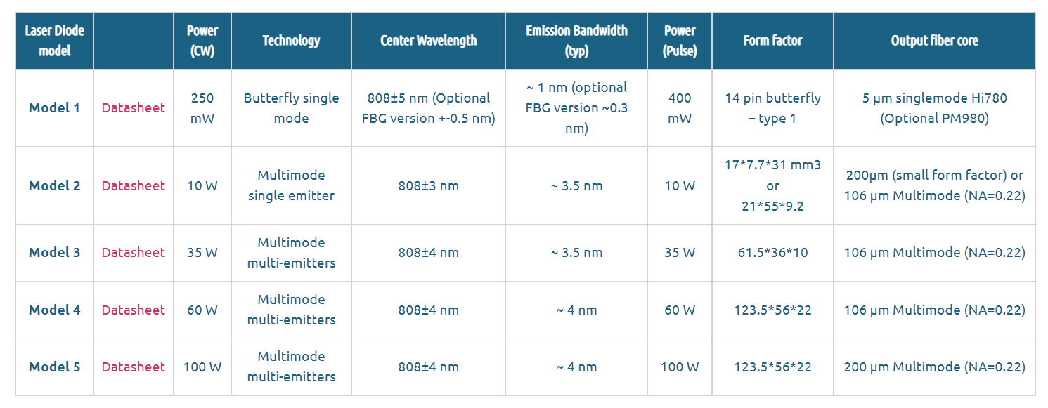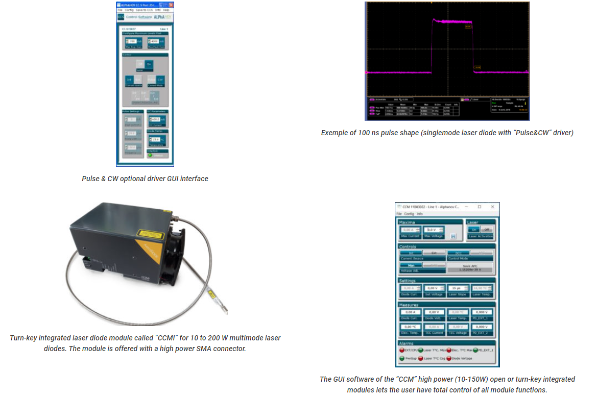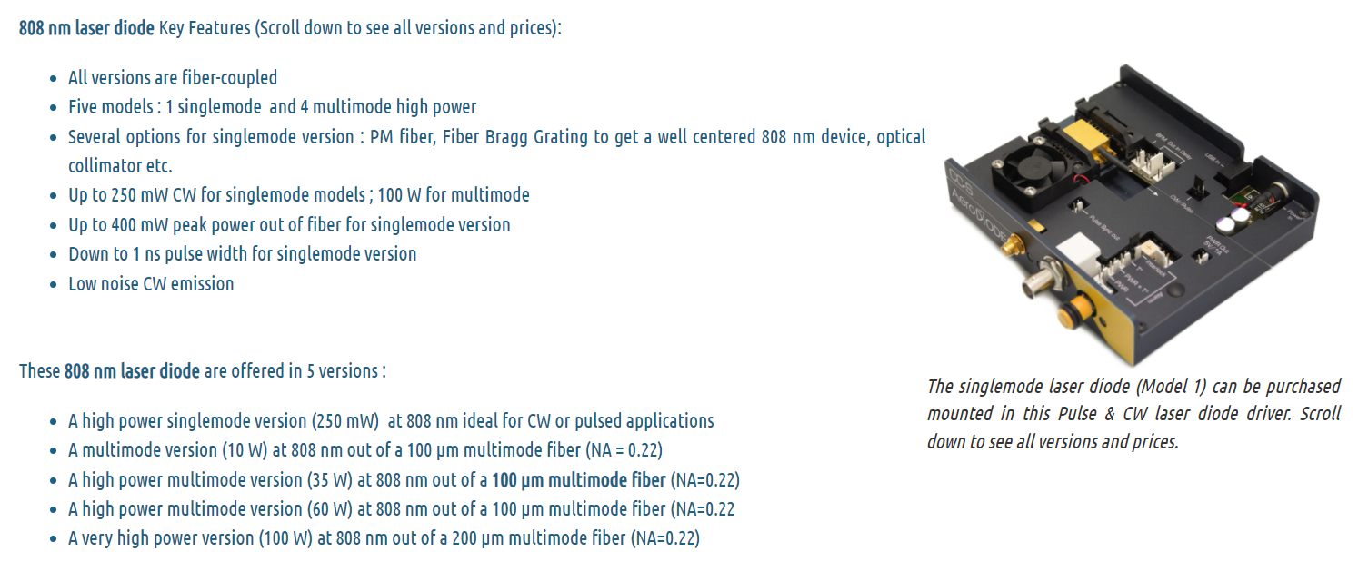 The single mode 808 nm laser diode can reach high power in nanosecond pulse regime up to 400 mW. Most Turn-key diode + driver solutions are optimized for single-shot to CW performances with pulse width lengths down to 1 nanosecond. The 808 nm laser diode precision pulses are generated internally by an on-board pulse generator, or on-demand from an external TTL signal. 4 multimode versions are offered for CW or pulsed emission up to 60 W in 100 µm core or 100 W in a 200 µm core multimode fiber.
