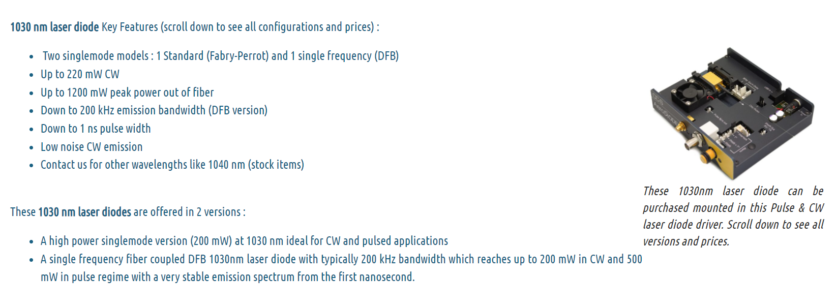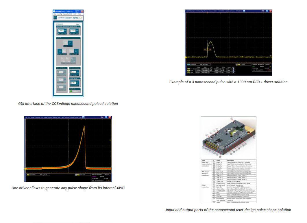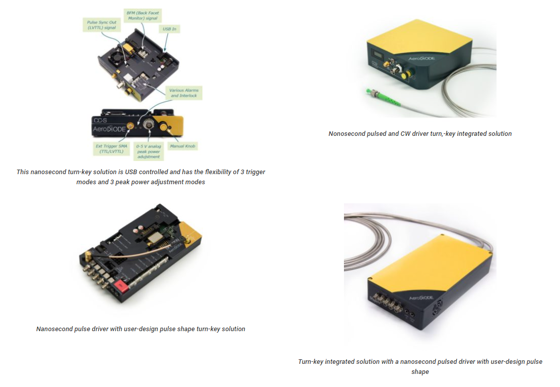 The 1030 nm laser diode can reach high power in nanosecond pulse regime up to 1.2 W. Most Turn-key diode+driver solutions are optimized for single-shot to CW performances with pulse width lengths down to 1 nanosecond. 1030 nm laser diode precision pulses are generated internally by an on-board pulse generator, or on-demand from an external TTL signal.