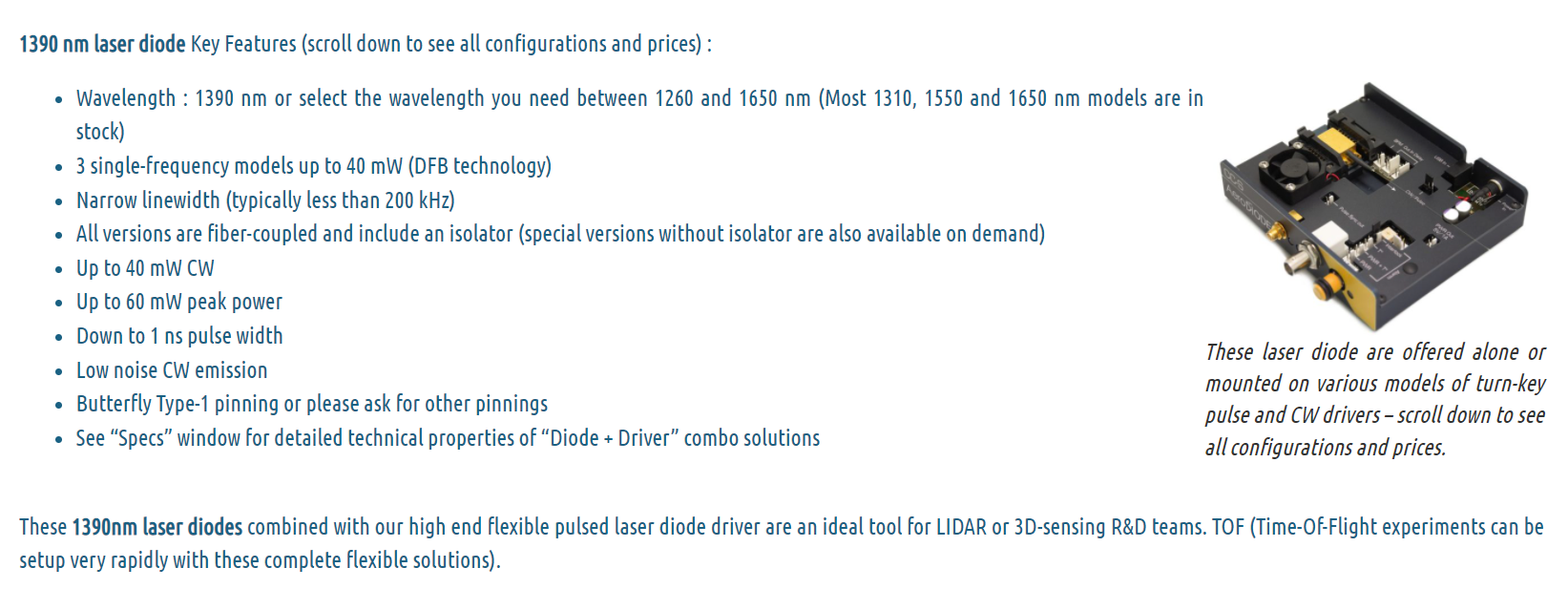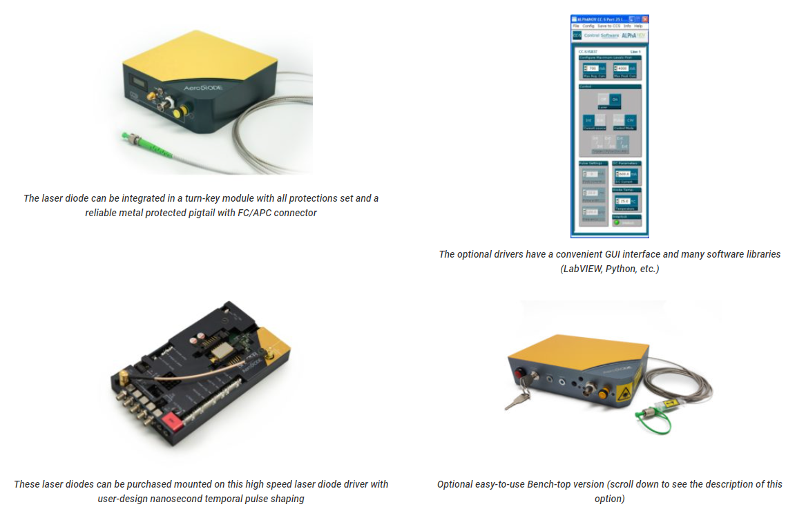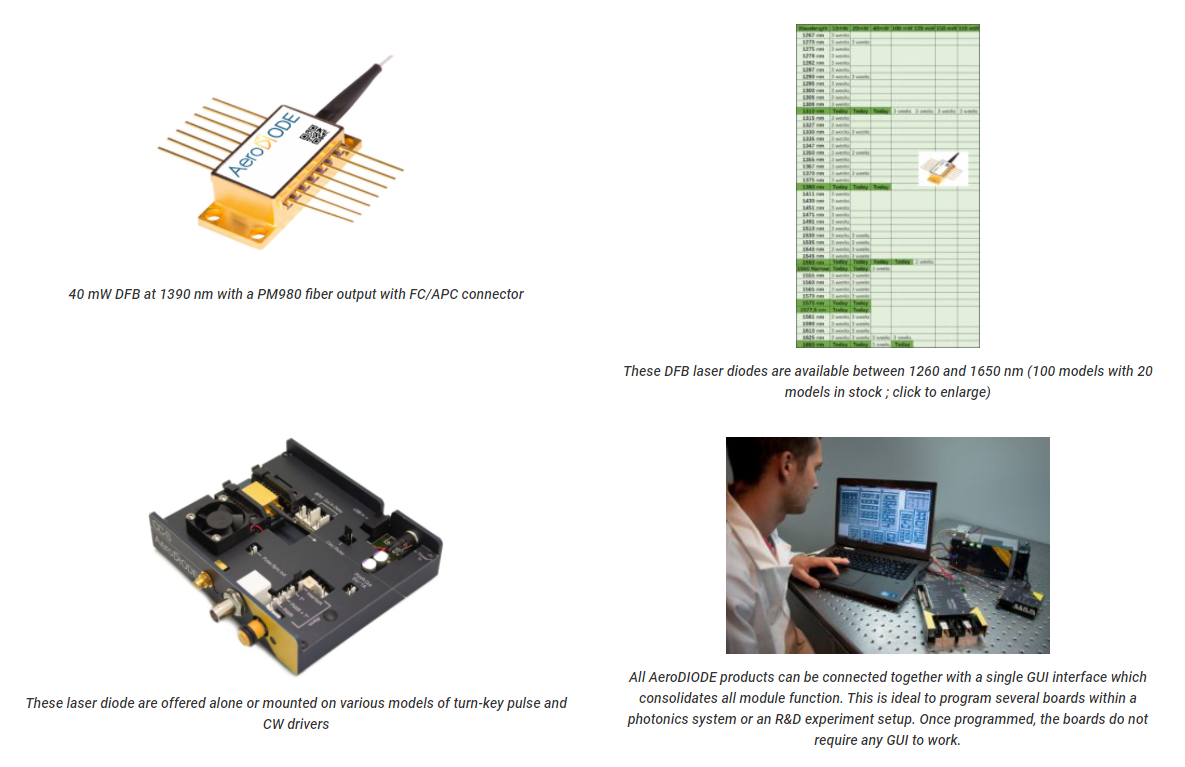 These fiber-coupled 1390 nm laser diodes are offered as stock items or associated with a low noise CW or Pulsed Laser Diode Driver. All 3 models are single frequency versions up to 40 mW. They are compatible with our high speed nanosecond pulsed drivers and this makes it an optimal solution for Telecommunication or 3D-sensing R&D.