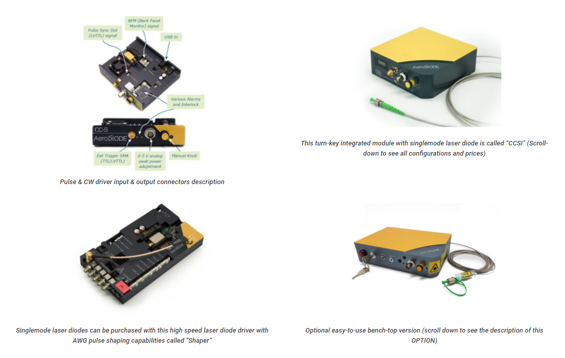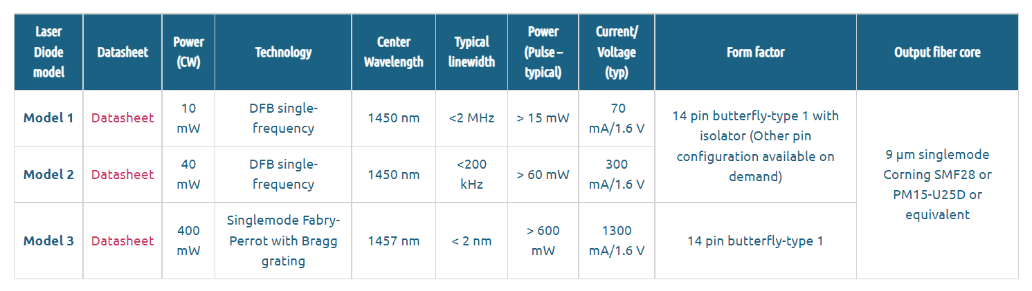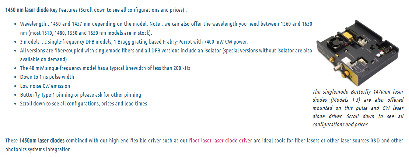 The singlemode 1450 nm laser diodes are extremely stable and low noise in CW regime due to the DFB or Bragg-grating technologies. Most Turn-key diode + driver solutions are optimized from single-shot to CW performances with pulse width lengths down to 1 nanosecond. The 1450nm laser diode precision pulses are generated internally by an on-board pulse generator, or on demand from an external TTL signal.