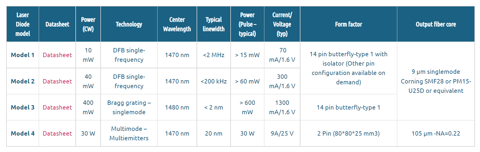 These fiber-coupled 1470 nm laser diodes are offered as stock items or associated with either a CW or pulsed laser diode driver. 2 butterfly DFB models are single-frequency versions up to 40 mW. They are compatible with our low noise CW or pulsed high speed nanosecond pulsed drivers and this makes it an optimal solution for thermal superficial laser matter interaction systems or Er3+-ions pumping.