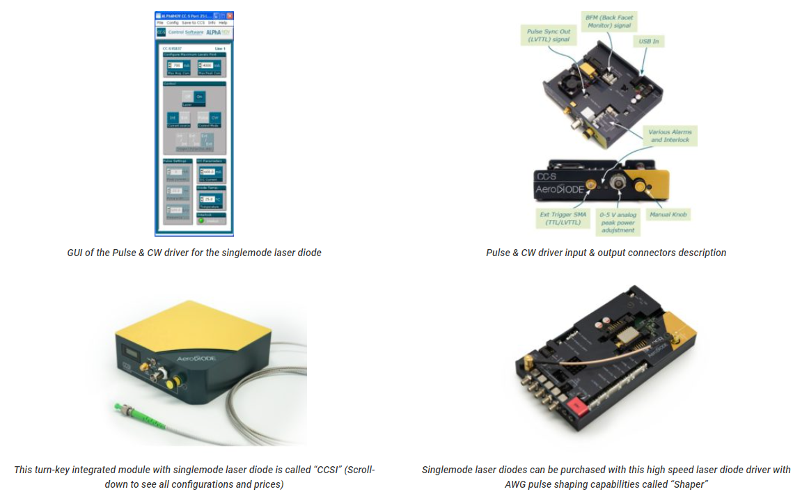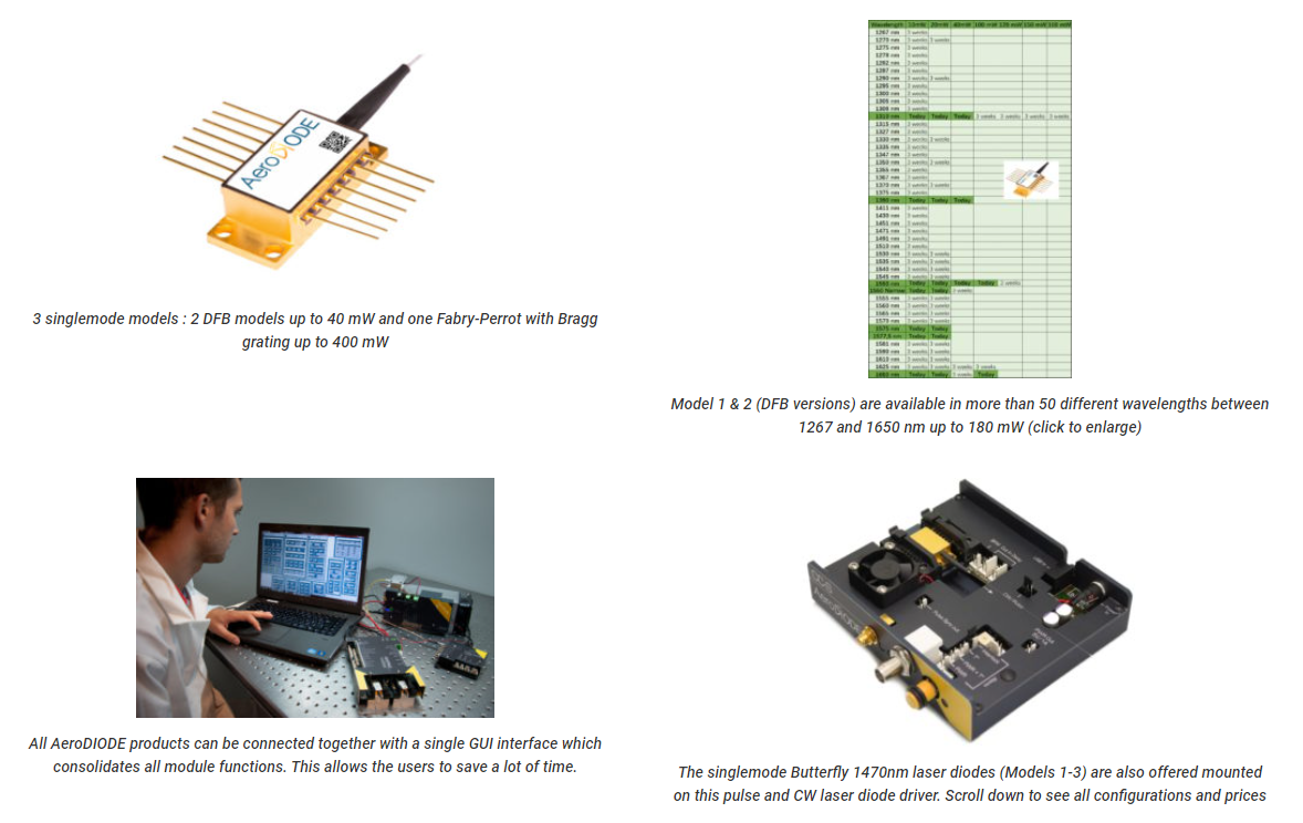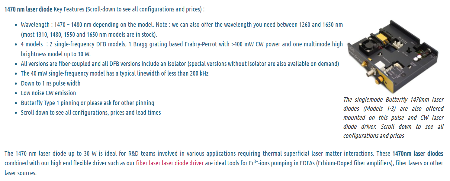 The singlemode 1470 nm laser diodes are extremely stable and low noise in CW regime due to the DFB or Bragg-grating technologies. Most Turn-key diode + driver solutions are optimized from single-shot to CW performances with pulse width lengths down to 1 nanosecond. The 1470nm laser diode precision pulses are generated internally by an on-board pulse generator, or on demand from an external TTL signal.
