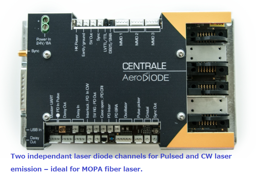 This fiber laser diode driver allows you to develop a complete fiber laser prototype in only a few weeks. There is one “pulsed & CW” channel for seed laser diode and one “CW” channel for pump laser diode. It is compatible with any type of fiber laser architectures : Mode-locked, Q-Switch, MOPA with any type of seeder like EOM modulated diodes, Gain Switched diodes, Microchip etc.