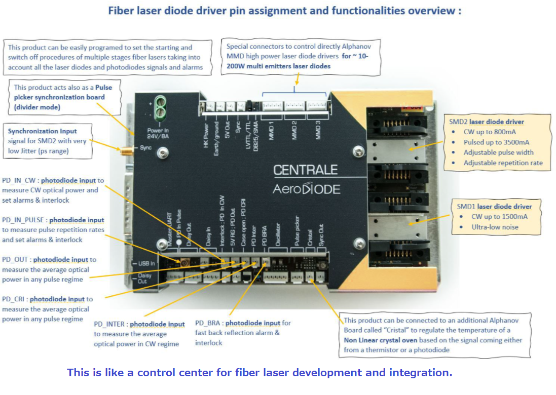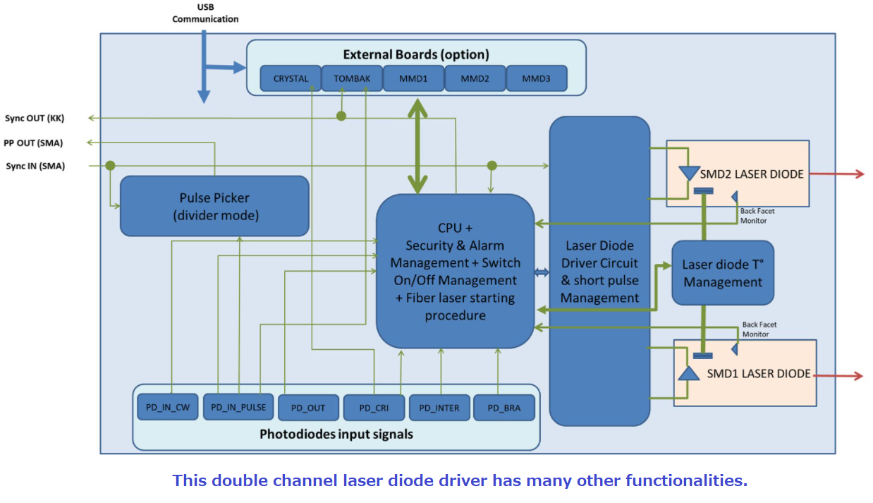This fiber laser diode driver integrates two laser diode drivers, 6 photodiode electronics, a pulse-picker synchronization tool and many other dedicated functionalities for nearly any type of fiber laser architecture.