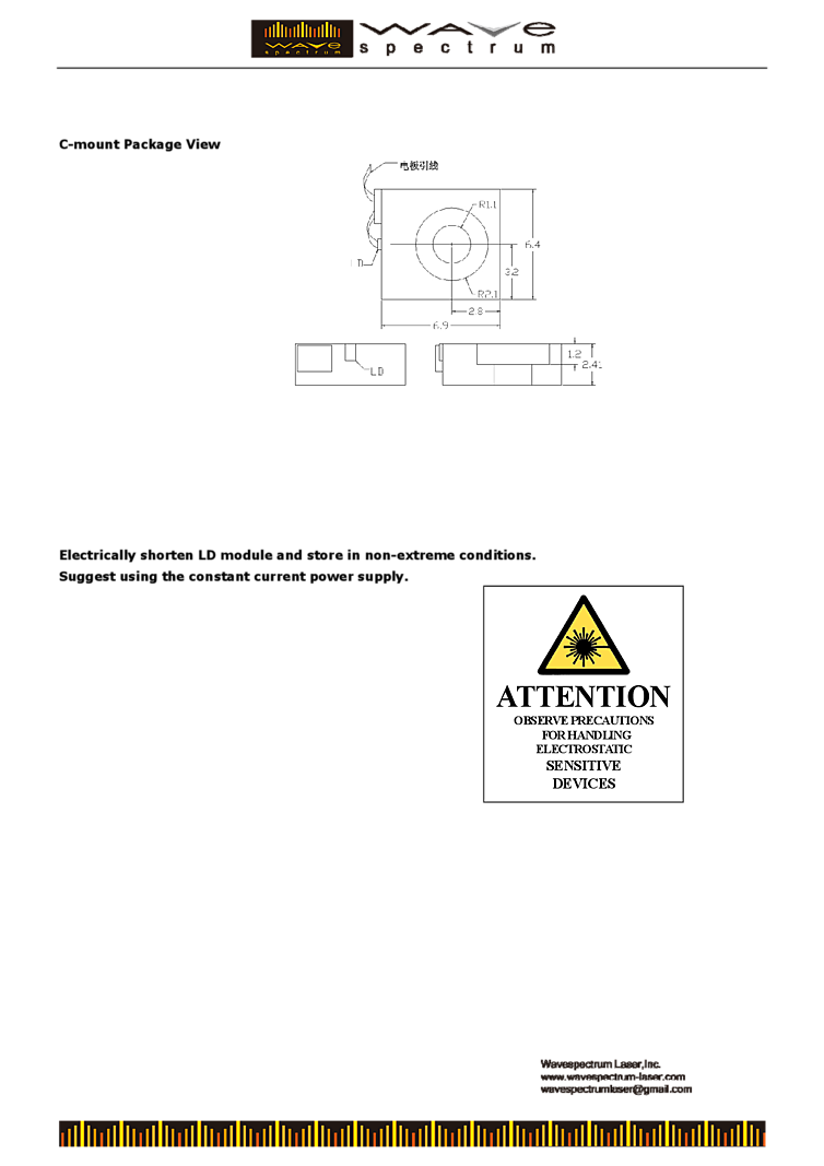 650nm The wavespectrum laser described in the data sheet attached details a 650nm laser with 500mW High Power optical output mounted in a C mount Package: Features include high power,CW mode of operation, multi-mode output and high quality in a c-mount package. Applications include medical laser treatments, laser indicators and laser detectors.
