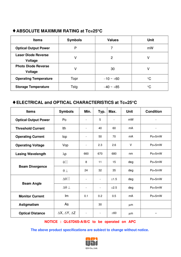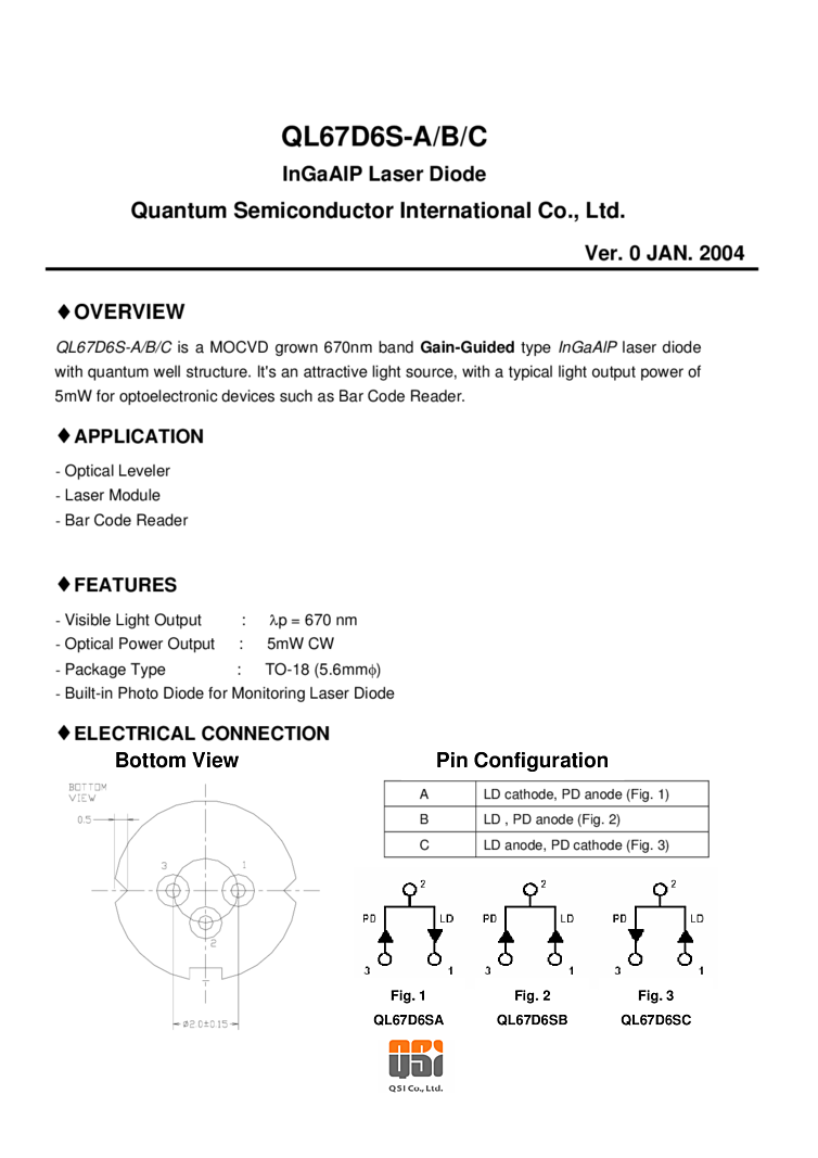 The QL67D6S-A/B/C is an MOCVD grown 670nm band Gain-Guided type InGaAlP laser diode with quantum well structure. It's an attractive light source, with a typical light output power of 5mW for optoelectronic devices such as Bar Code Readers.