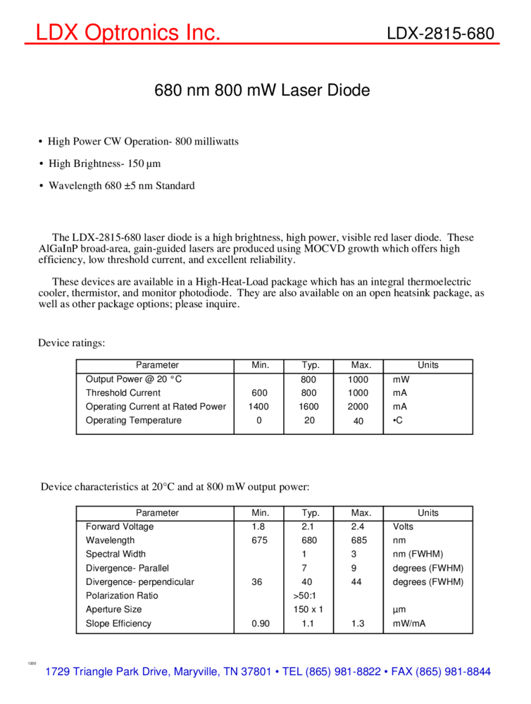 The LDX-2815-680 laser diode is a high brightness, high power, visible red laser diode. These AlGaInP broad-area, gain-guided lasers are produced using MOCVD growth which offers high efficiency, low threshold current, and excellent reliability.