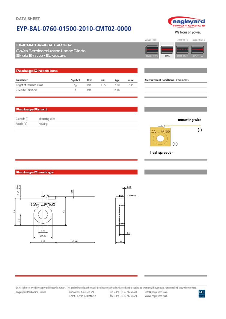 760nm laser diode from eagleyard Photonics offers up to 1.6W of ouput power. This broad area device references the following features and applications described in the product brochure: This 760nm device is a GaAs laser diode with single emitter structure. Applications include materials processing and medical applications. This eagleyard device lists a recommended operational temperature at case between 10 and 25 degrees C, a forward current of 1.8 Amps and optical output power of 1.6 Watts.