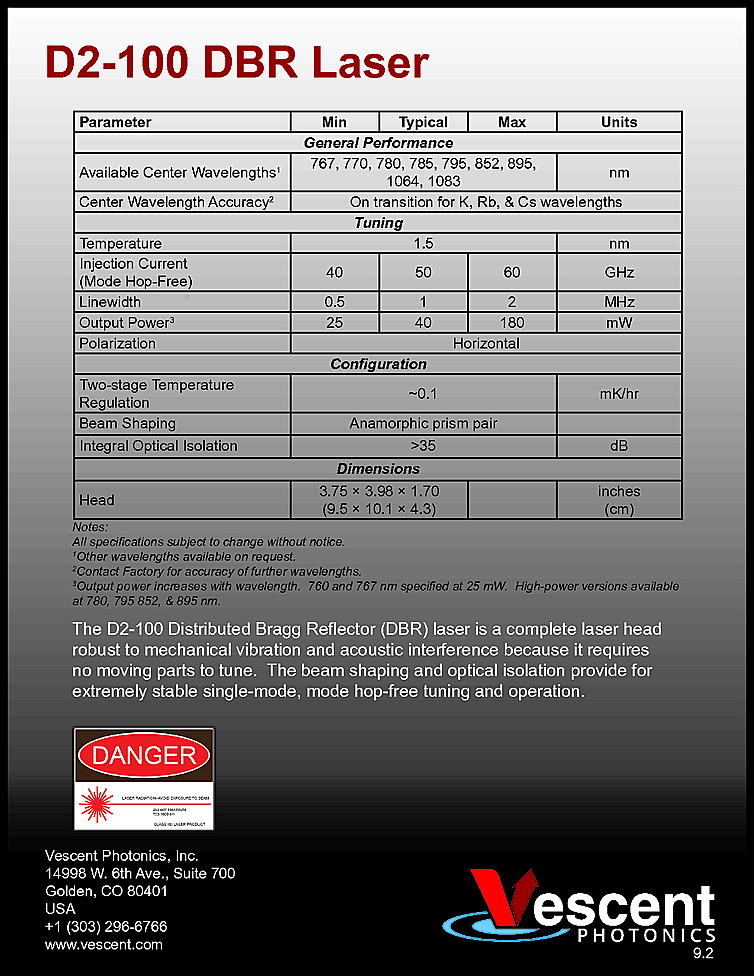 The D2-100-DBR laser module is comprised of a Distributed Bragg Reflector (DBR) laser diode in a precision temperature-controlled housing with beam conditioning optics and an optical isolator. DBR laser diodes are fabricated with the feedback grating patterned directly adjacent to the gain section of the diode. They are highly immune to vibrations and by virtue of a very short cavity (~1 mm), they can be injection current tuned mode hop-free over more than 40 GHz, enabling very fast servo control for easy locking to atomic and molecular transitions. The D2-100 is a complete, ready-to-use laser module. It includes an anamorphic prism pair for beam Circularization and a 35dB optical isolator for clean, dependable mode hop-free operation.